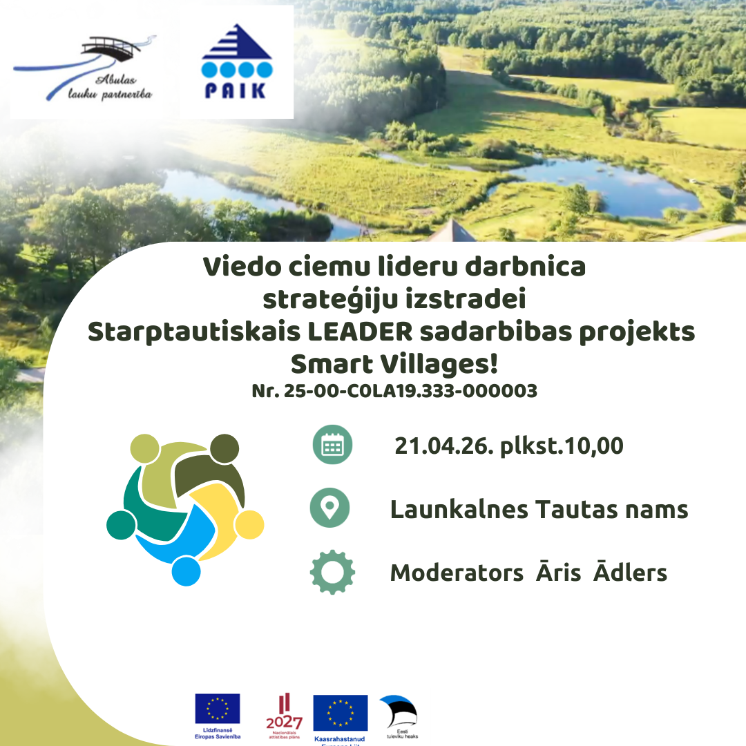 2026.gada 12. februārī Mēru muižā, Bilskas pagastā, norisināsies starptautiskā LEADER sadarbības projekta “Viedie ciemi” (Nr. 25-00-COLA19.333-000003) partneru kopīga darba diena, ko organizē Abulas lauku partnerība sadarbībā ar PAIK (Igaunija). Pasākuma mērķis ir stiprināt Latvijas un Igaunijas kopienu sadarbību, dalīties pieredzē par viedo ciemu pieejām un kopīgi izstrādāt metodes, kas palīdzētu vietējām kopienām kļūt stiprākām, drošākām un inovatīvākām.