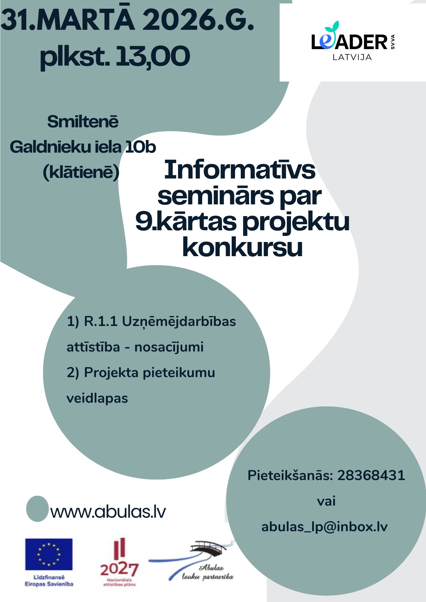 Aicinām uz informatīvo semināru par 9. kārtas projektu konkursu, kas notiks 2026. gada 31. martā, plkst. 13.00, Smiltenē, Galdnieku ielā 10b (klātienē).Izsludināts 9.kārtas projektu konkurss